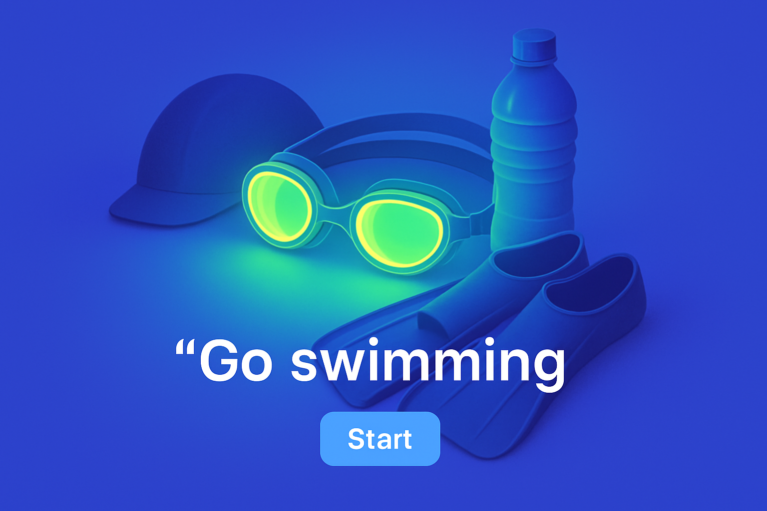 /Collection: /by davooda/Type: PNG/A vibrant composition featuring swimming gear, including goggles, fins, and a cap, all illuminated with a glowing aqua hue against a solid blue background. The scene invites viewers to embrace the swimming experience.