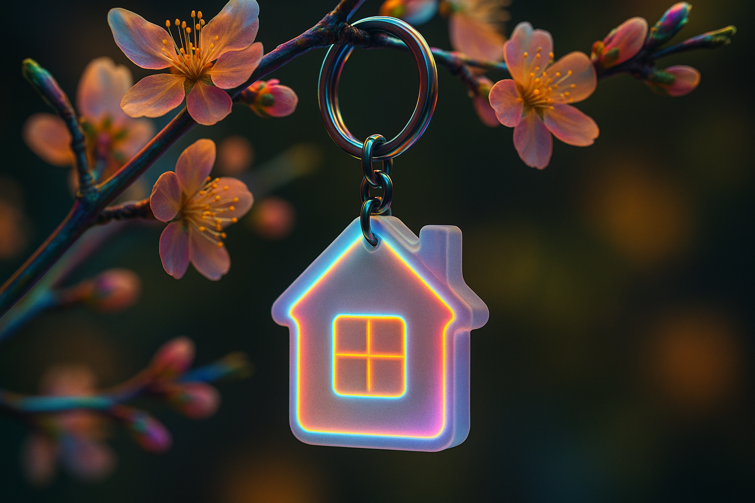 /Collection: /by davooda/Type: PNG/A visually striking close-up of a colorful home-shaped keychain hanging from a branch adorned with delicate blossoms, creating a harmonious blend of nature and personal items, ideal for real estate or home decor themes.