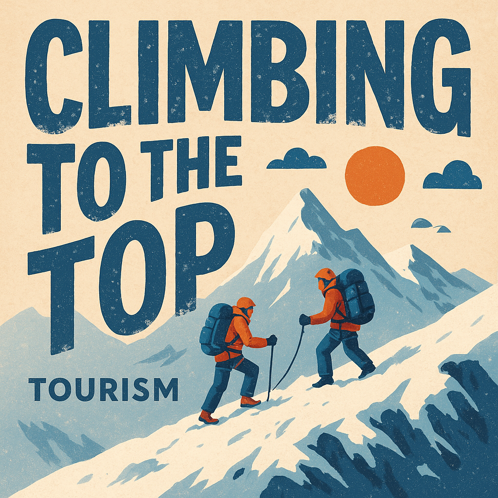 Illustrative poster showcasing climbers ascending a mountain, emphasizing adventure tourism with a retro style. Ideal for travel agencies or outdoor events.