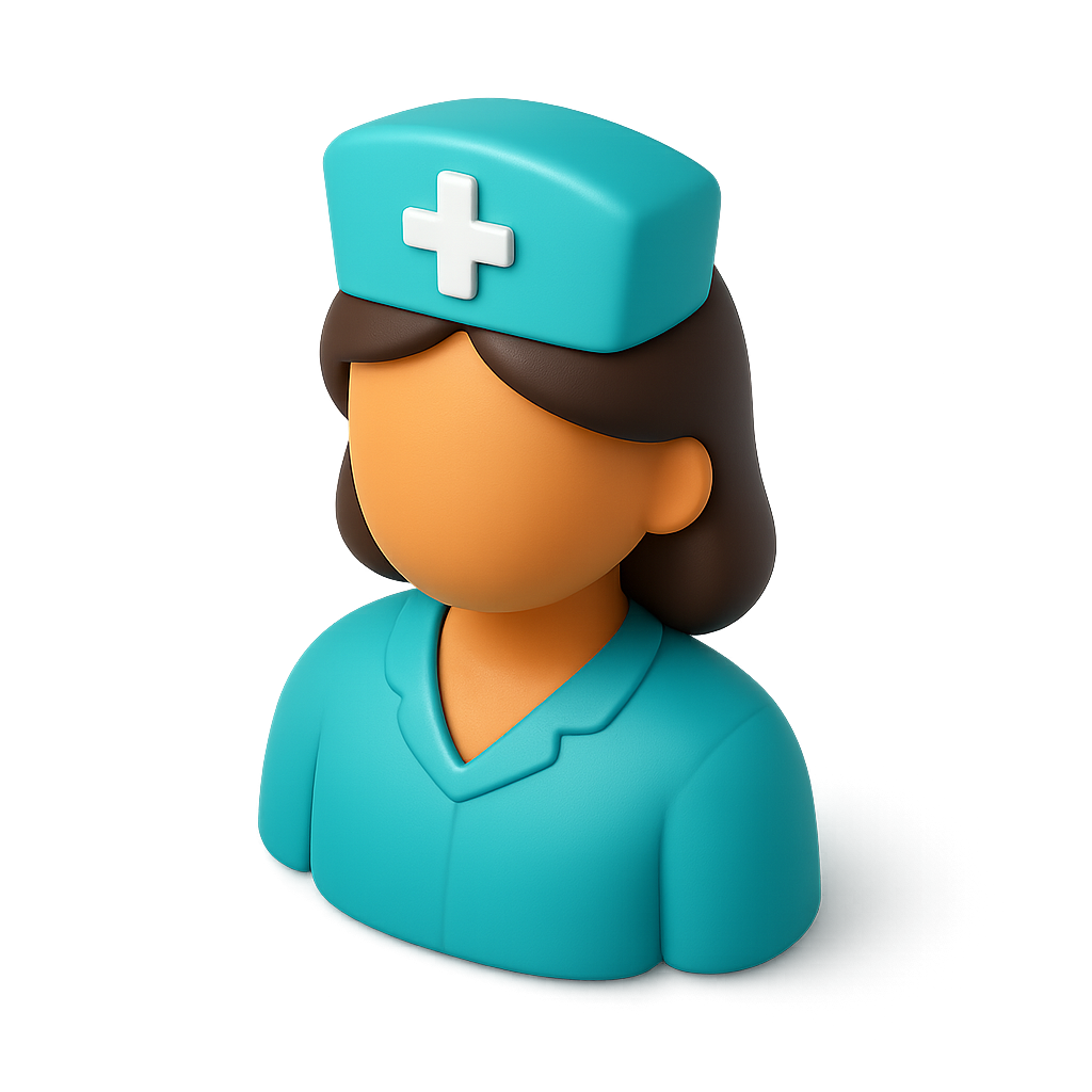 A simple 3D icon of a nurse depicted in a three-quarter view. The design features a blue nurse's cap with a white cross and a turquoise uniform, set against a soft gradient background.