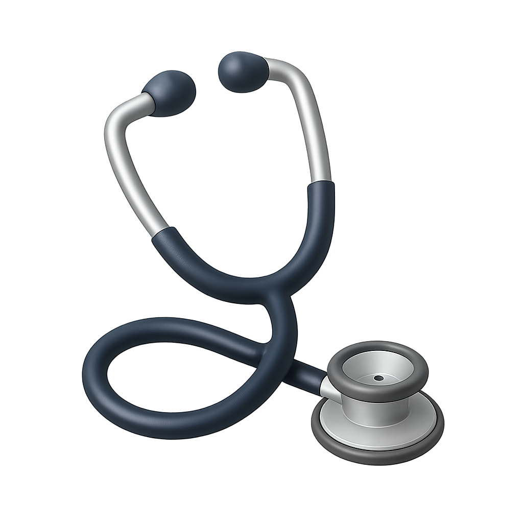A 3D icon of a stethoscope designed for listening to heartbeats, featuring a transparent background and an isometric view, emphasizing its volumetric appearance.