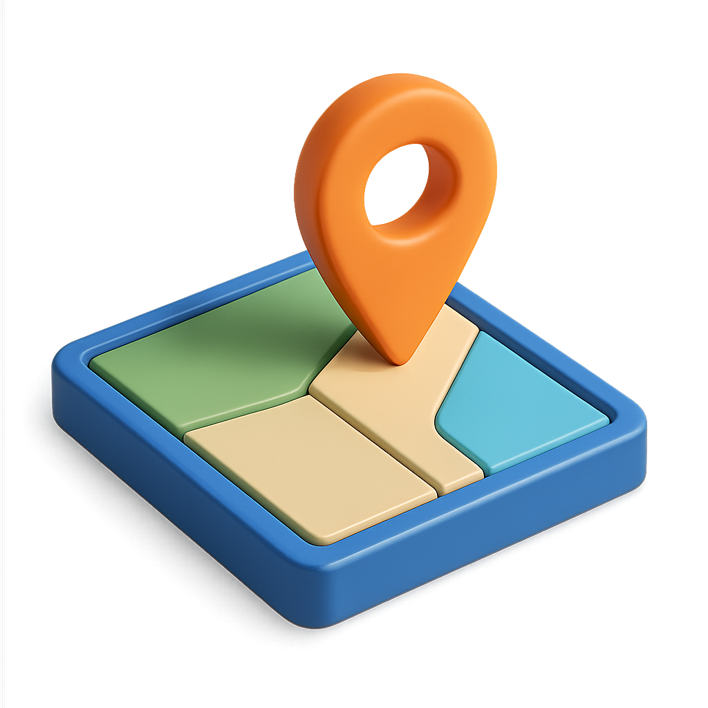 A 3D isometric icon depicting a map with distinct colored sections and a prominent location pin in orange. The design features a three-quarter view with a volumetric effect.