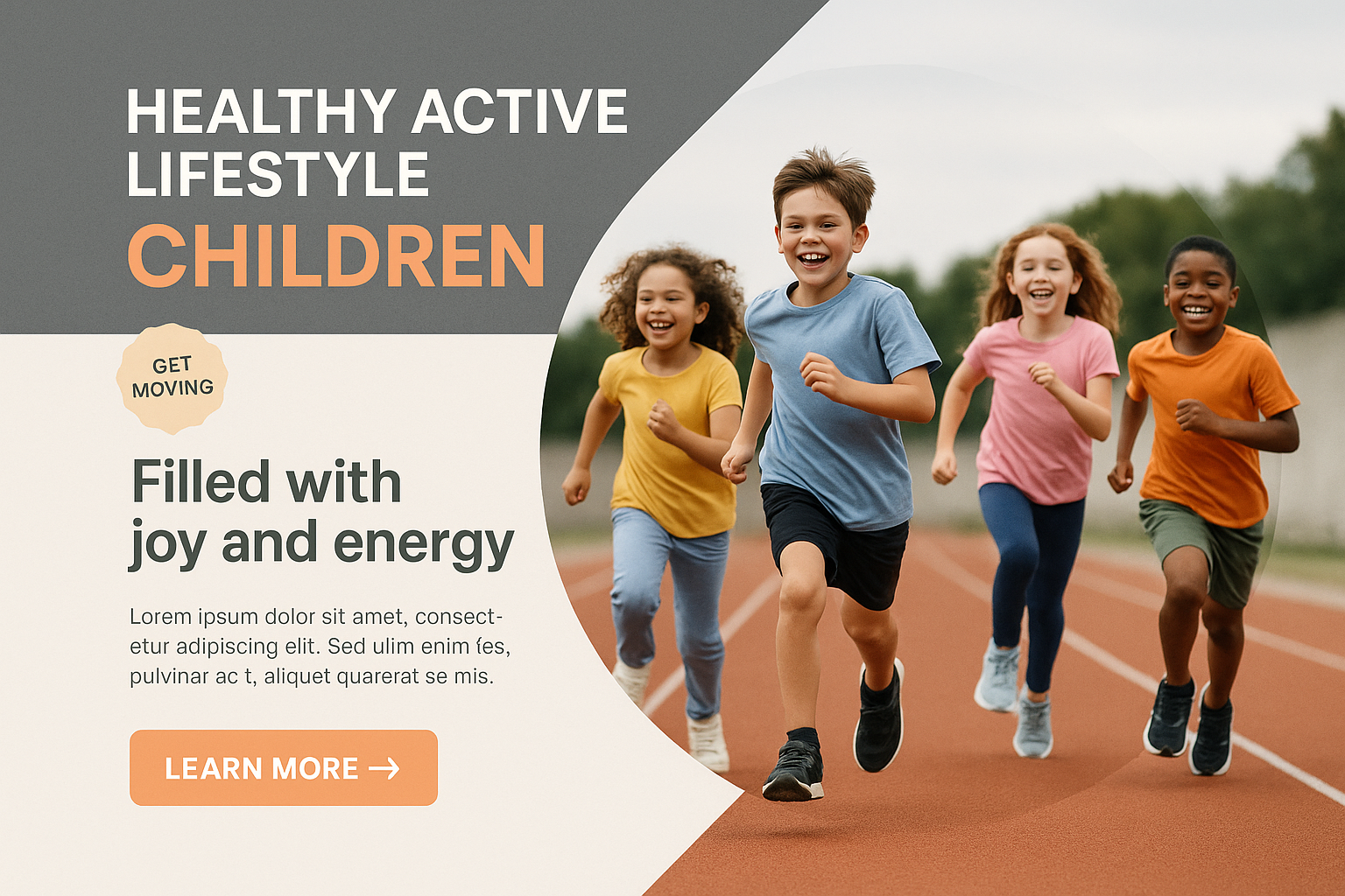 /Collection: /by davooda/Type: PNG/A vibrant scene of children running energetically on an athletic track, embodying a healthy and active lifestyle. The composition features a balanced layout with engaging design elements.