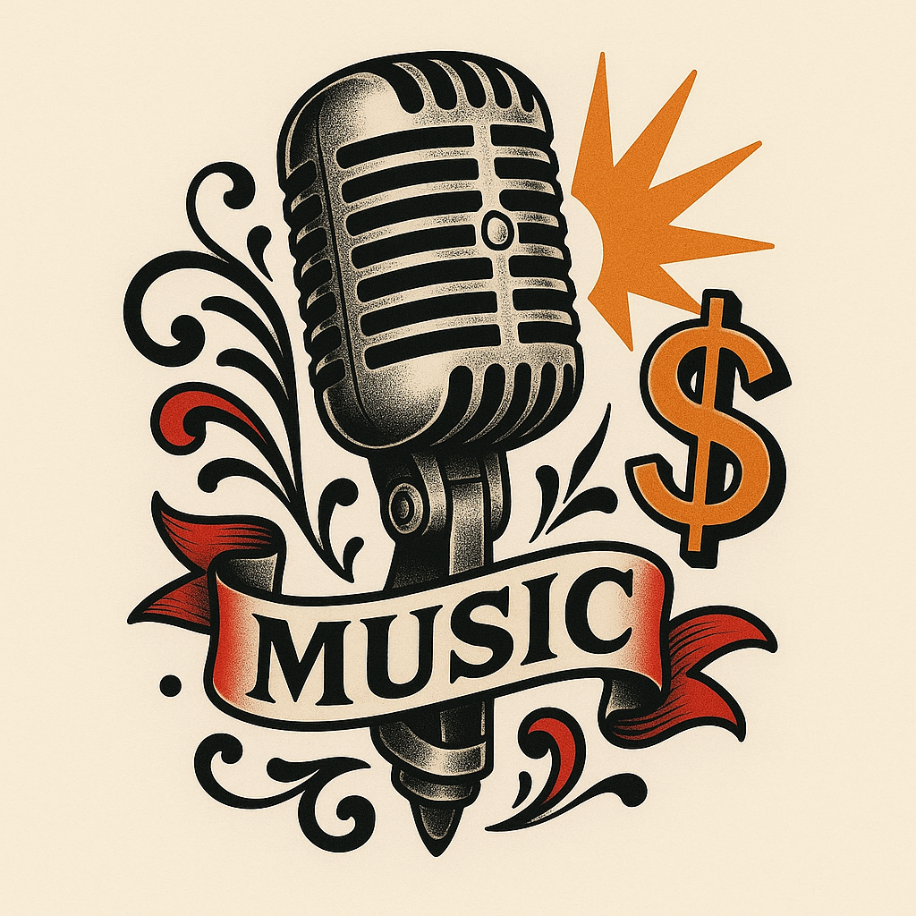 Stylized illustration featuring a vintage microphone surrounded by decorative elements and a dollar sign, ideal for music-related branding or promotional materials.