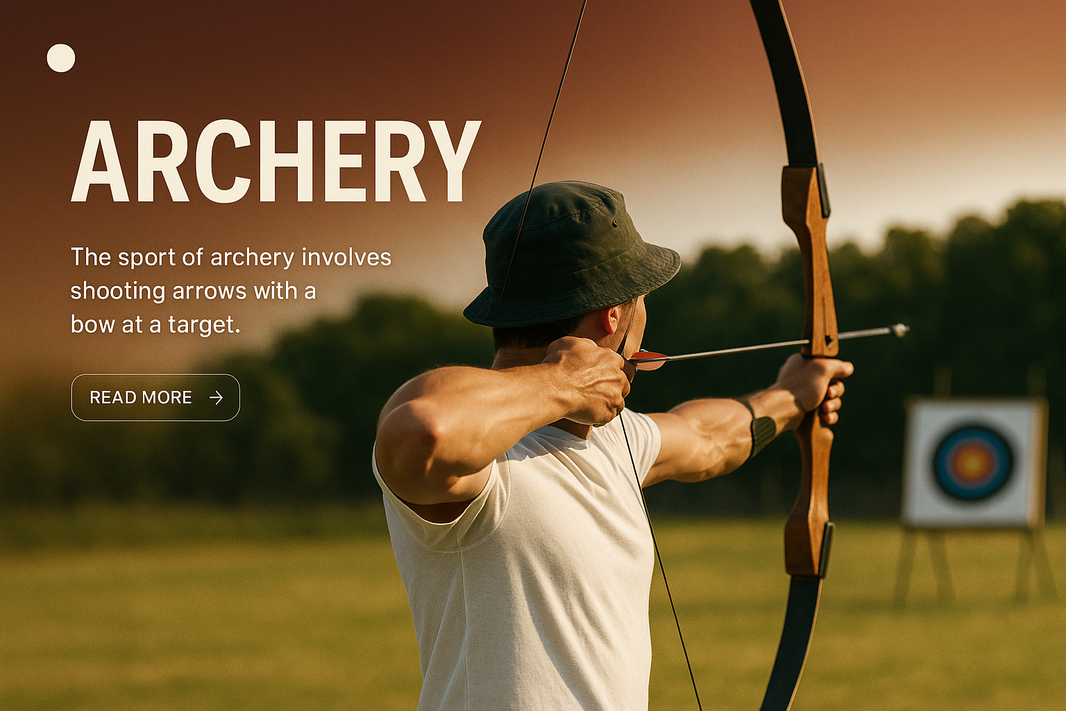A person aiming with a bow in a natural setting, showcasing the sport of archery. The background features a target, emphasizing skill and focus.