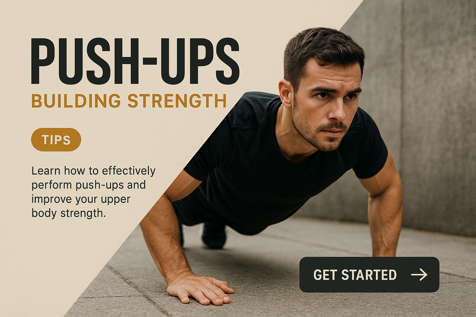 A visually appealing push-up guide featuring a man demonstrating the exercise. The design includes a strong title, tips, and a call-to-action button, set against a neutral background.