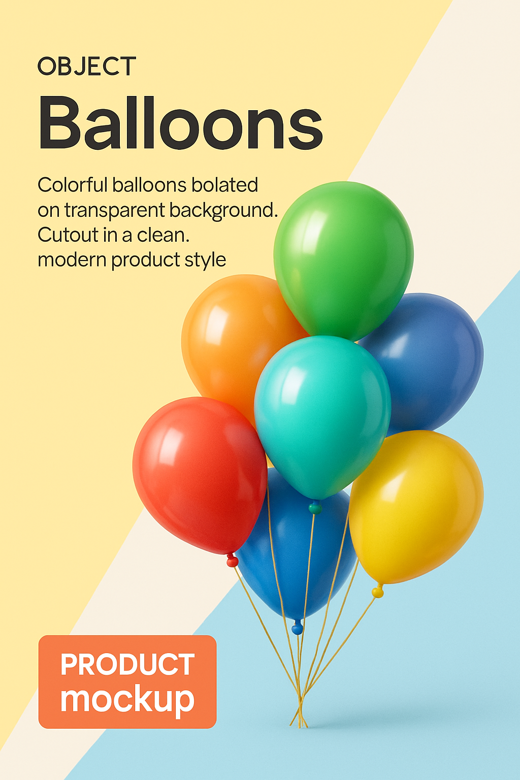/Collection: /by davooda/Type: PNG/This image features a striking arrangement of colorful balloons set against a contrasting diagonal background. With bold typography and modern design elements, it serves as a dynamic product advertisement.