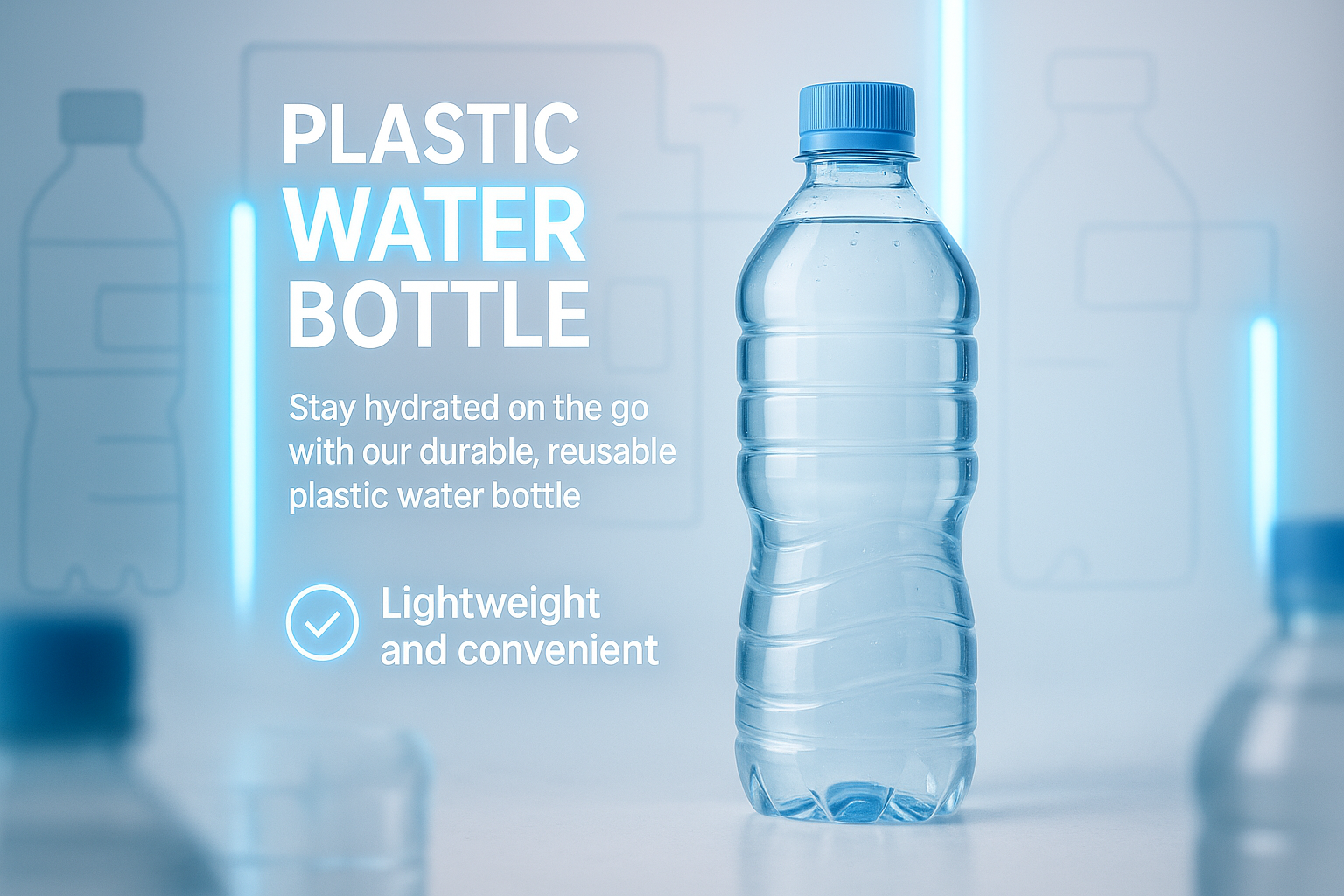 Product advertisement showcasing a clear plastic water bottle with an emphasis on its lightweight and convenient features. Ideal for eco-friendly marketing.