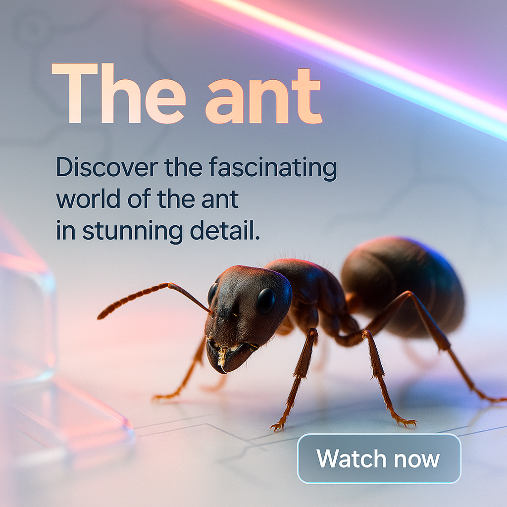 /Collection: /by davooda/Type: PNG/Engaging promotional graphic featuring a close-up of an ant against a futuristic background, designed to draw interest and encourage exploration of the subject.