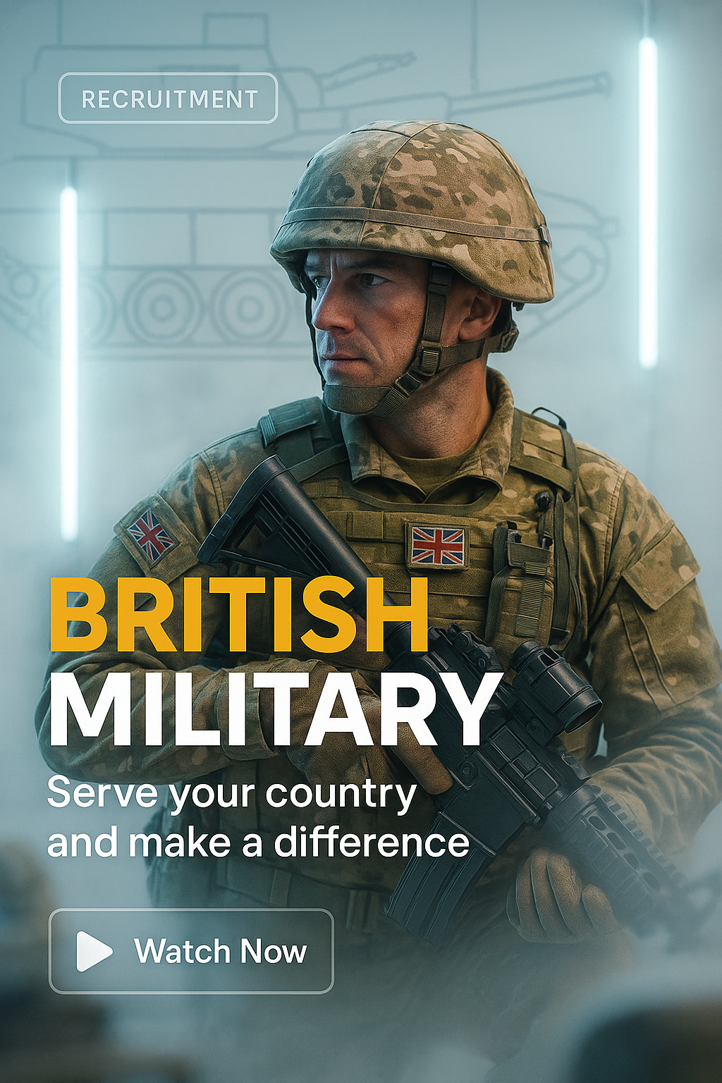 /Collection: /by davooda/Type: PNG/Dynamic recruitment poster showcasing a British soldier in military attire, designed to inspire service in the armed forces. Ideal for social media and promotional campaigns.