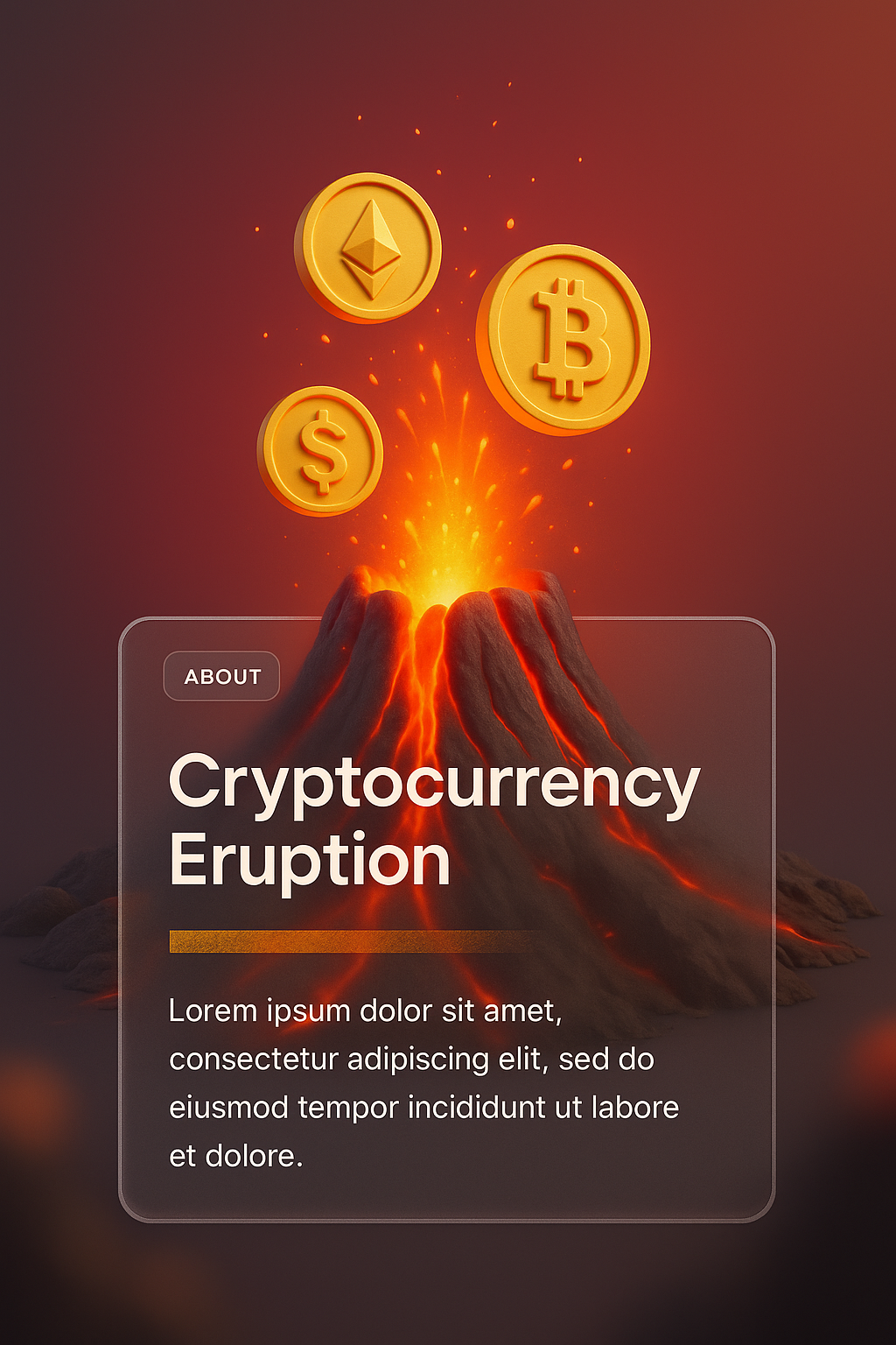 /Collection: /by davooda/Type: PNG/A dramatic 3D illustration of a volcano erupting with glowing cryptocurrency coins. The scene features a smooth gradient background and a transparent block containing descriptive text and graphics.
