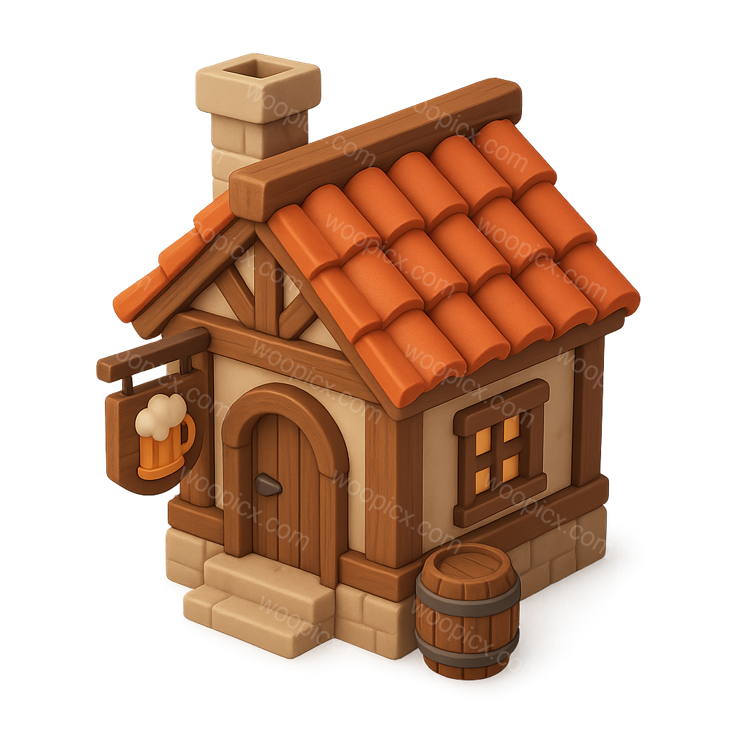 A charming 3D icon of a tavern featuring a beer mug sign, wooden door, and barrel. The design showcases a three-quarter view with a warm, inviting color palette.