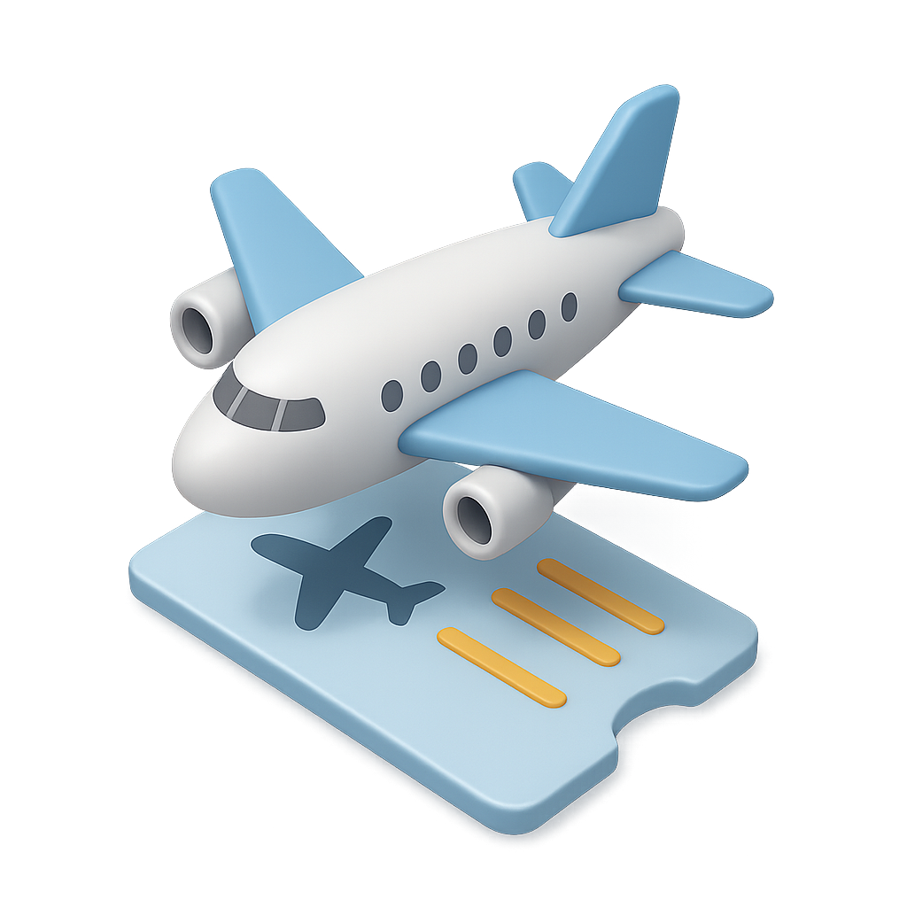 /Collection: /by davooda/Type: PNG/A stylized 3D flight ticket featuring a blue and white airplane icon. The ticket design includes runway markings, presented from a three-quarter view with a transparent background.