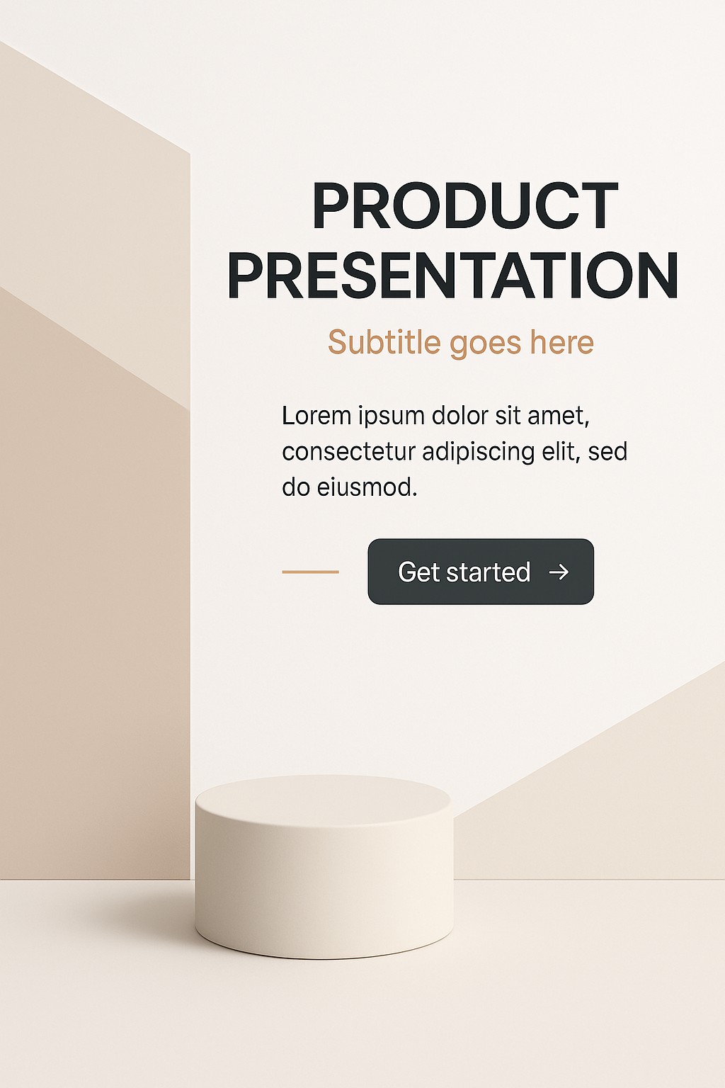 A minimalistic product presentation design featuring a podium against a white background with geometric shapes. The layout includes a prominent title and a call-to-action button.