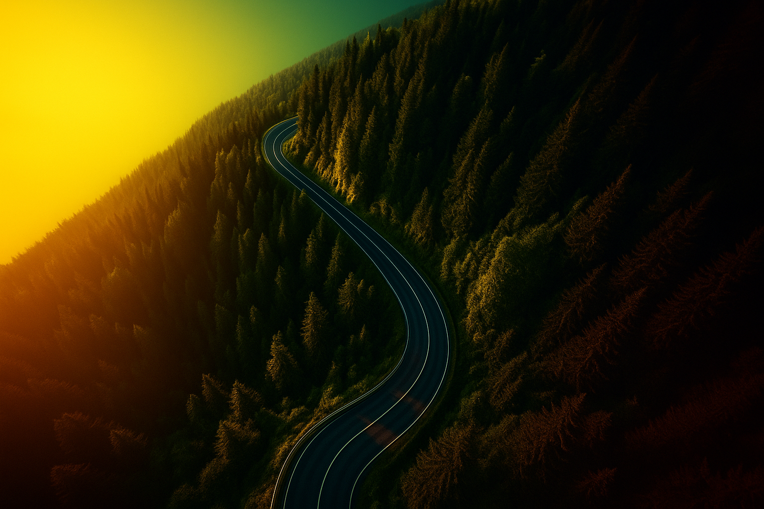 /Collection: /by davooda/Type: PNG/A stunning aerial view captures a winding mountain road nestled in a dense, dark green forest. The scene features dynamic lighting from both sides, creating a contrasting color palette that enhances the realism.