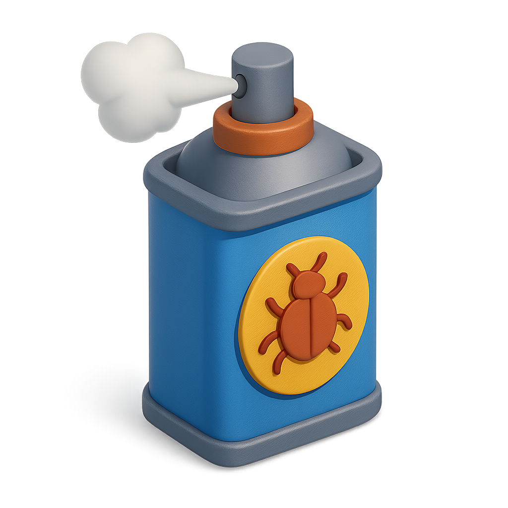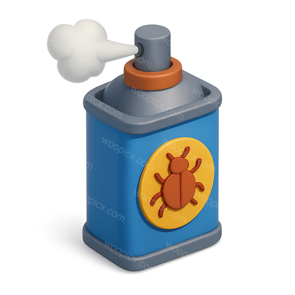 A stylized 3D icon of a bug spray canister in a three-quarter view, featuring a colorful design with a bug emblem and a spray effect, set against a smooth gradient background.