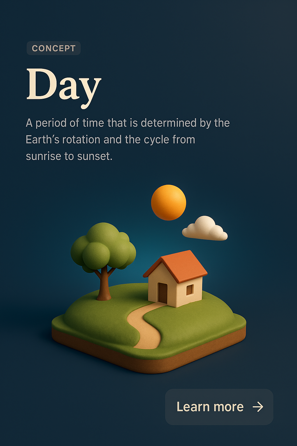 /Collection: /by davooda/Type: PNG/This image features a small 3D scene representing a daytime landscape with a house, tree, and sun. The dark gradient background enhances the vibrant colors of the elements, creating a cohesive and appealing design.