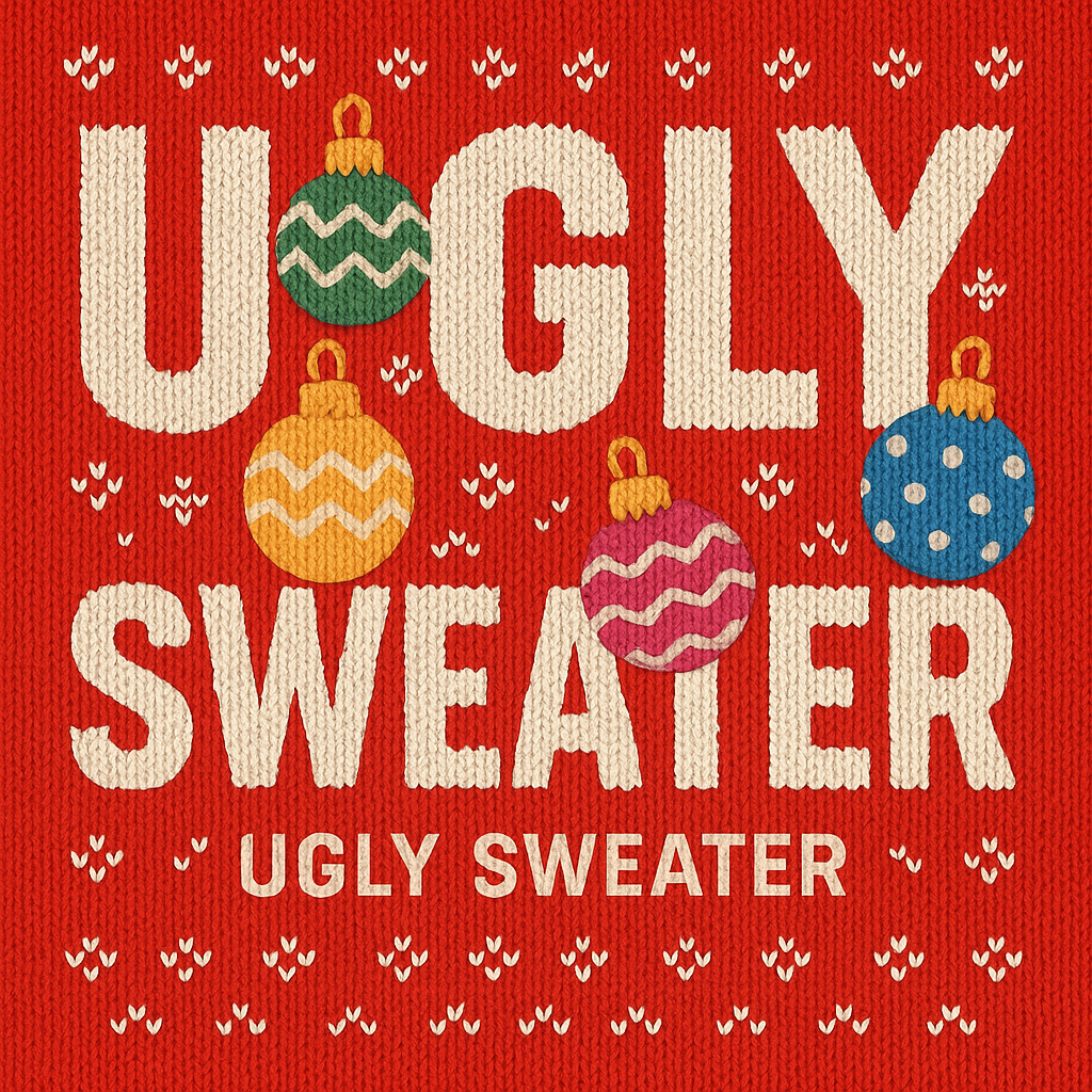 /Collection: /by davooda/Type: PNG/Playful graphic featuring bold text and colorful ornament illustrations, perfect for holiday-themed marketing or apparel. Captures the fun spirit of ugly sweater parties.