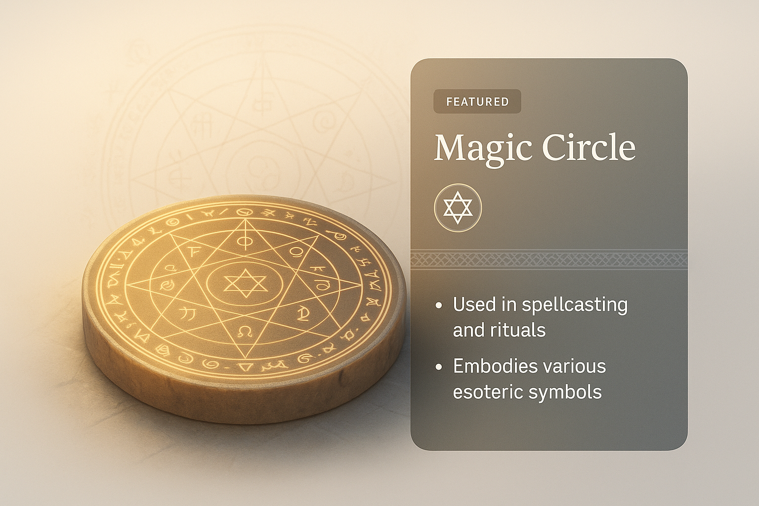 A 3D illustration of a magic circle featuring esoteric symbols. The design integrates light gradients and a semi-transparent block for text, enhancing readability.