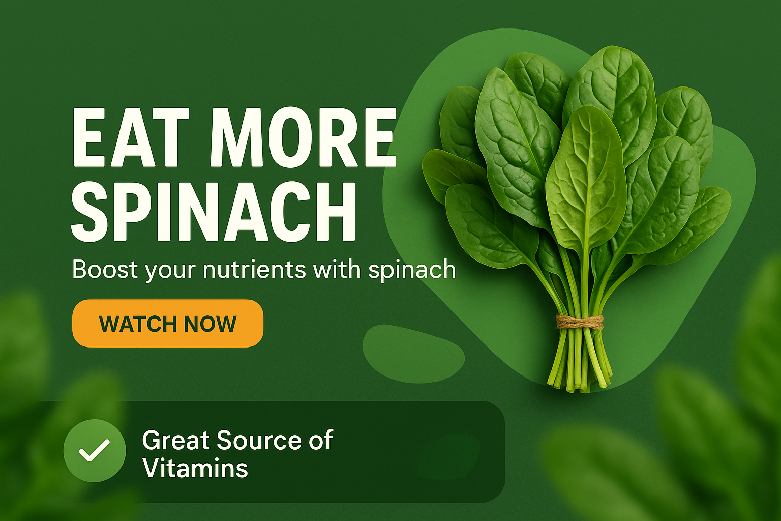Engaging promotional graphic featuring fresh spinach with a call to action, designed to encourage healthy eating and nutrient awareness.