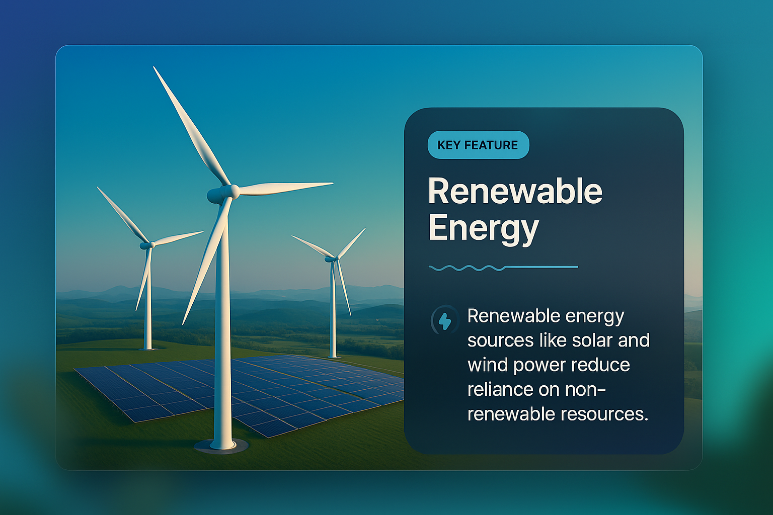 /Collection: /by davooda/Type: PNG/The image showcases an aerial view of wind turbines and solar panels, highlighting renewable energy solutions. A modern design element features a key feature box emphasizing the importance of renewable energy.
