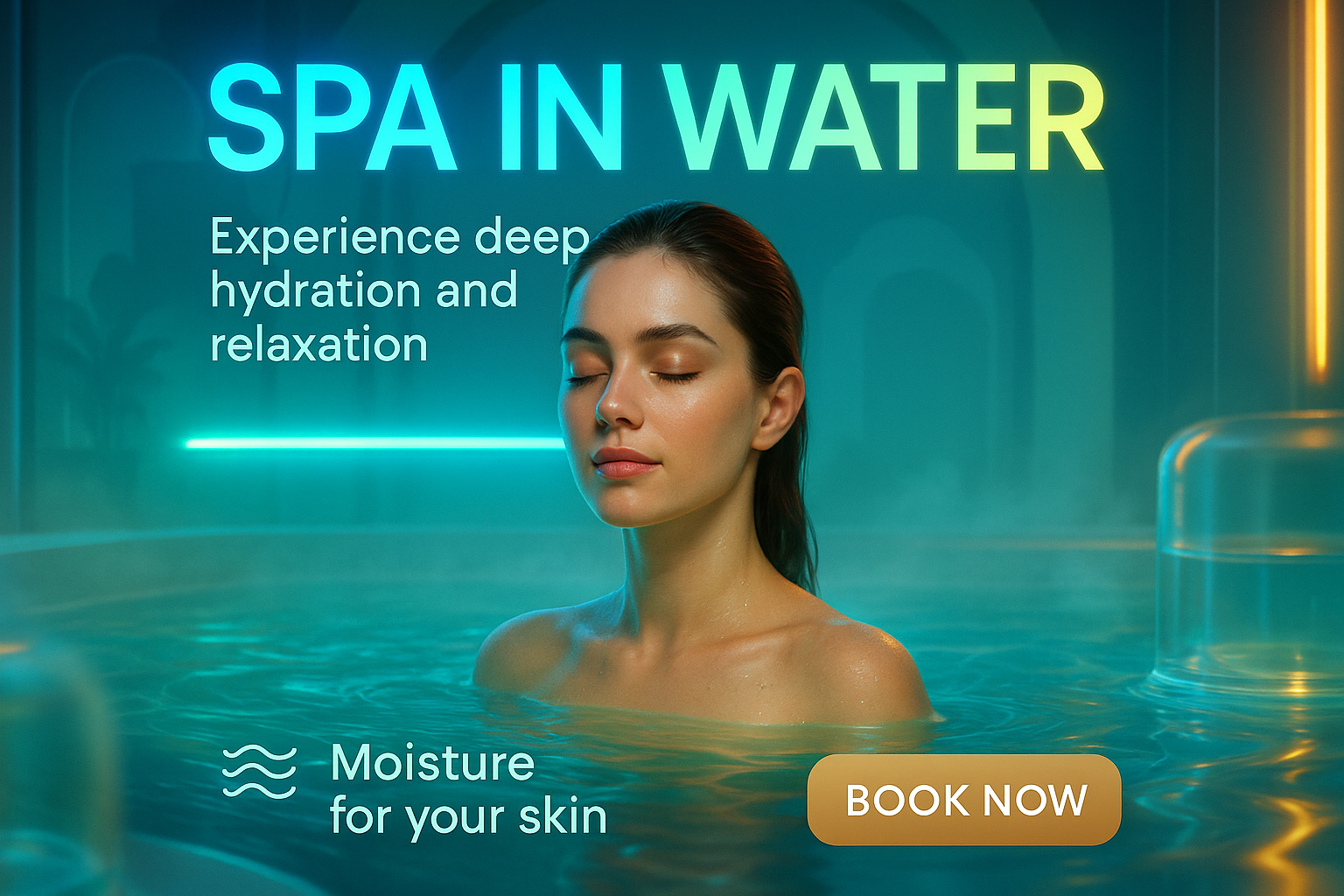 Engaging promotional banner showcasing a serene spa atmosphere with a focus on hydration and relaxation, ideal for wellness marketing.