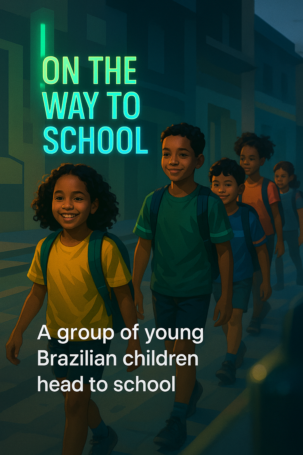 /Collection: /by davooda/Type: PNG/A vibrant illustration depicting a group of young Brazilian children joyfully walking to school, showcasing a lively urban setting. Ideal for educational content and community initiatives.