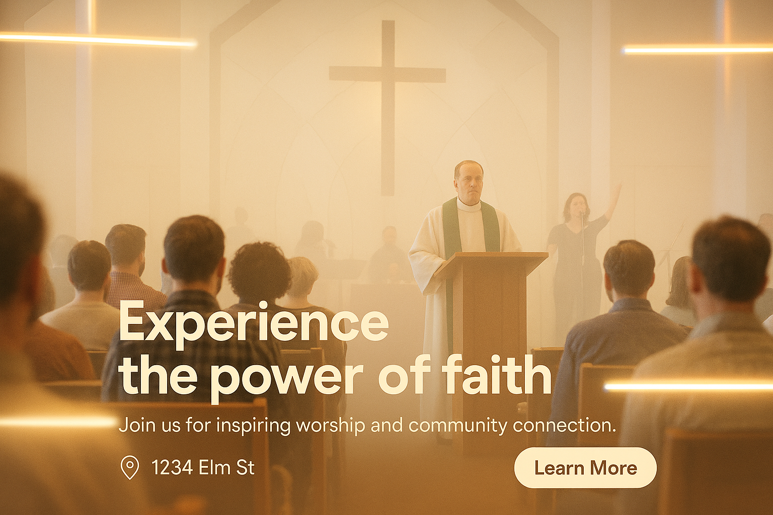 A visually inviting worship event invitation featuring a speaker at a podium in a serene church setting, perfect for community outreach and engagement.