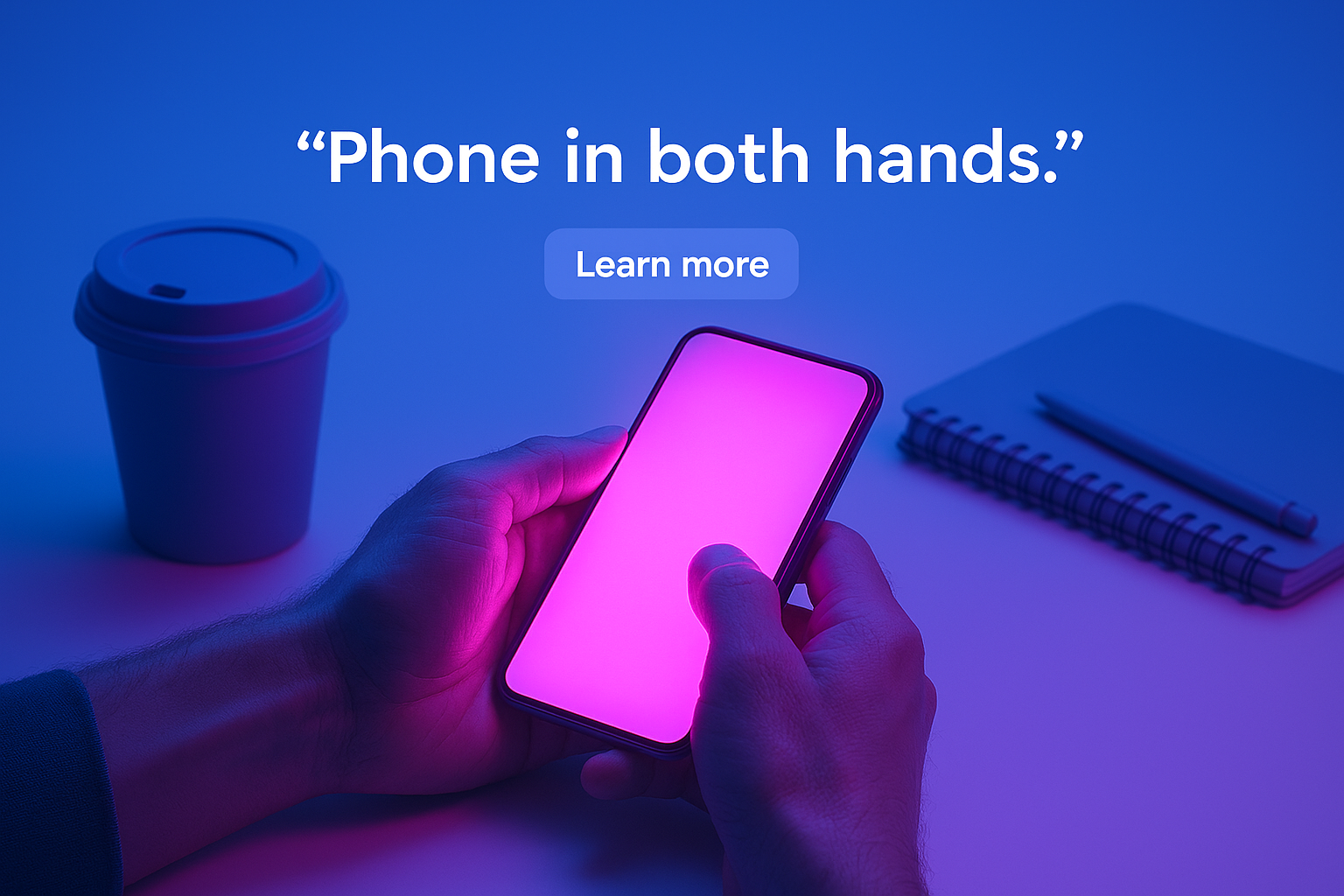 A striking image of a phone held in both hands, glowing with a neon pink light against a solid blue background. Surrounding objects add context to the scene.