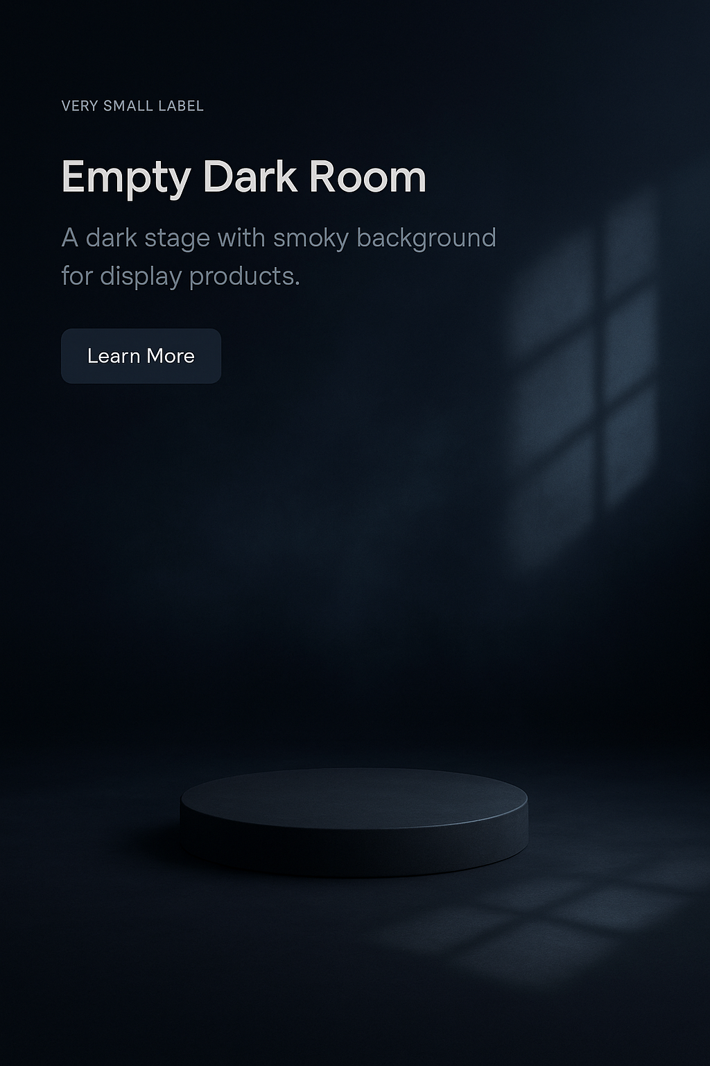 A minimalistic 3D illustration of an empty dark room with a smoky blue backdrop. The scene features subtle window shadows and a podium for displaying products.