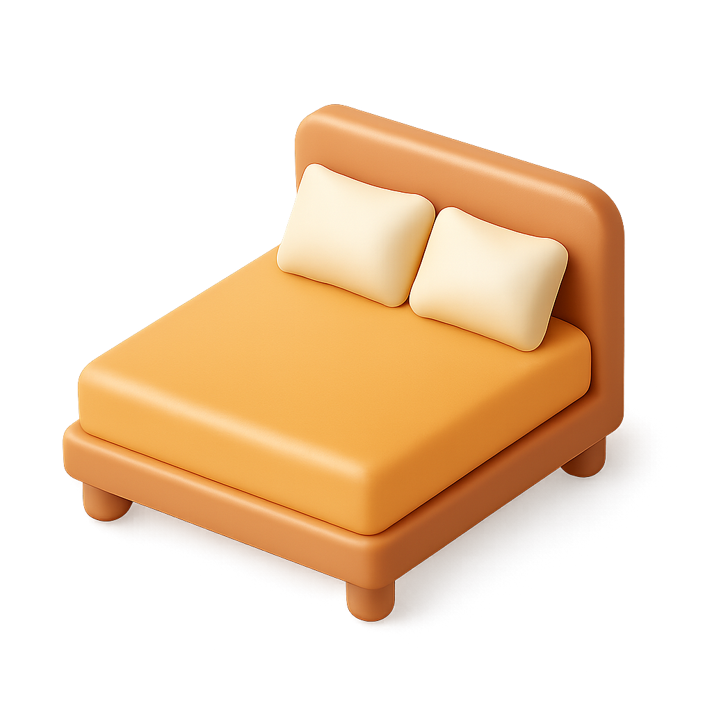 A visually appealing 3D icon of a bed featuring two soft pillows. The design includes a rounded headboard and an orange color scheme, set against a smooth gradient background.