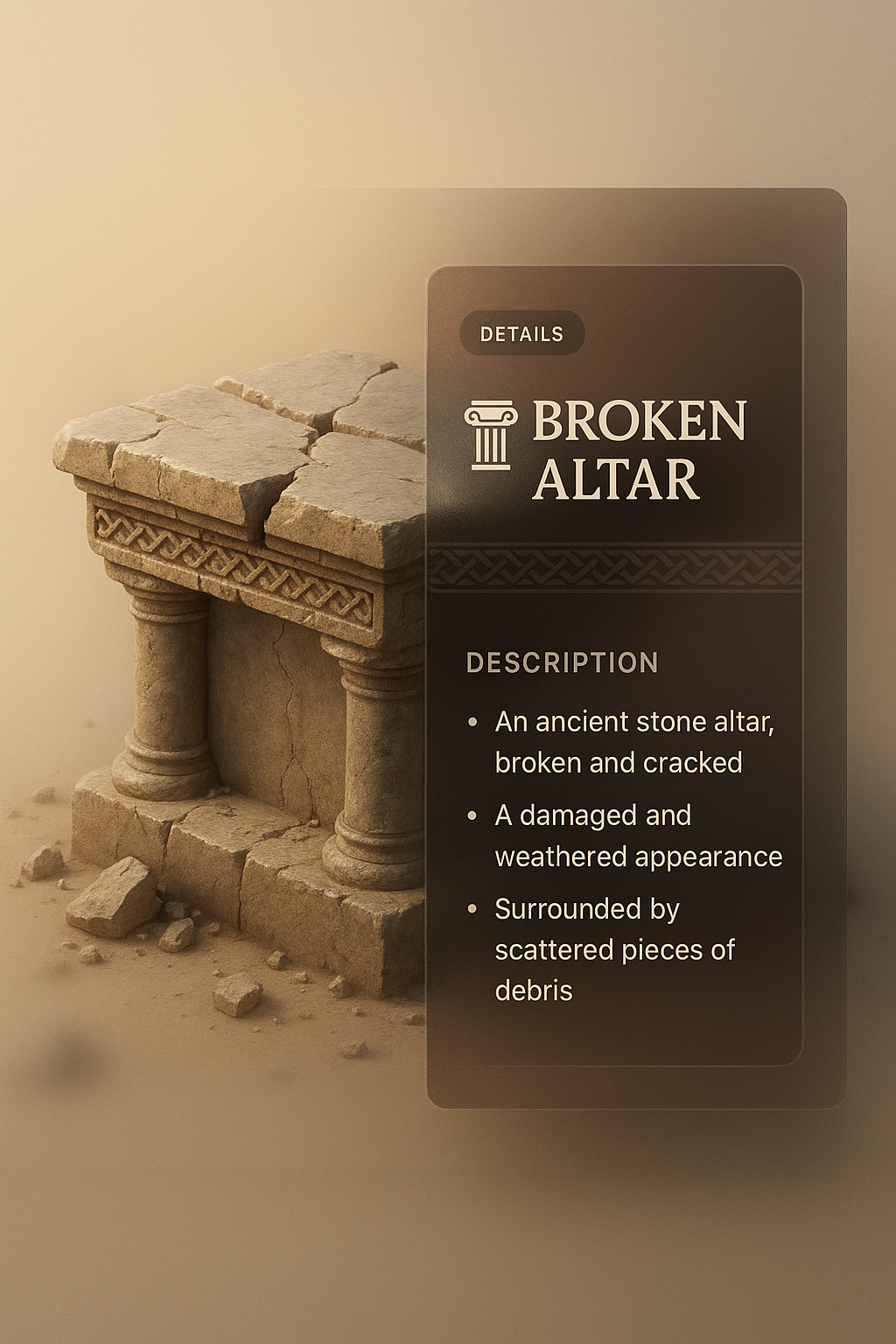 This image features a broken stone altar, showcasing its damaged and weathered structure. It's complemented by a descriptive overlay, enhancing its visual appeal.