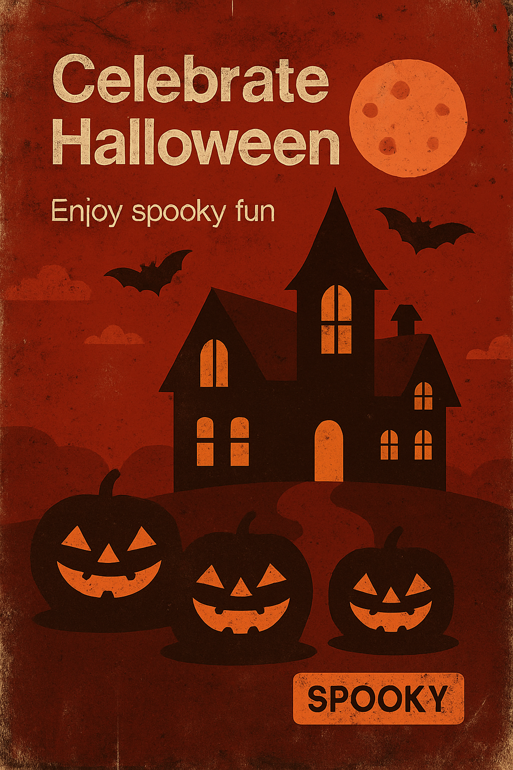 A vintage-style Halloween poster featuring a haunted house, pumpkins, and bats, ideal for Halloween event promotions or decorations.