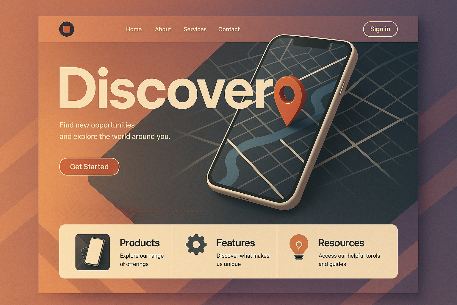 /Collection: /by davooda/Type: PNG/A modern landing page design featuring a 3D map with a phone and vibrant colors. The layout includes oversized typography, action buttons, and product sections.