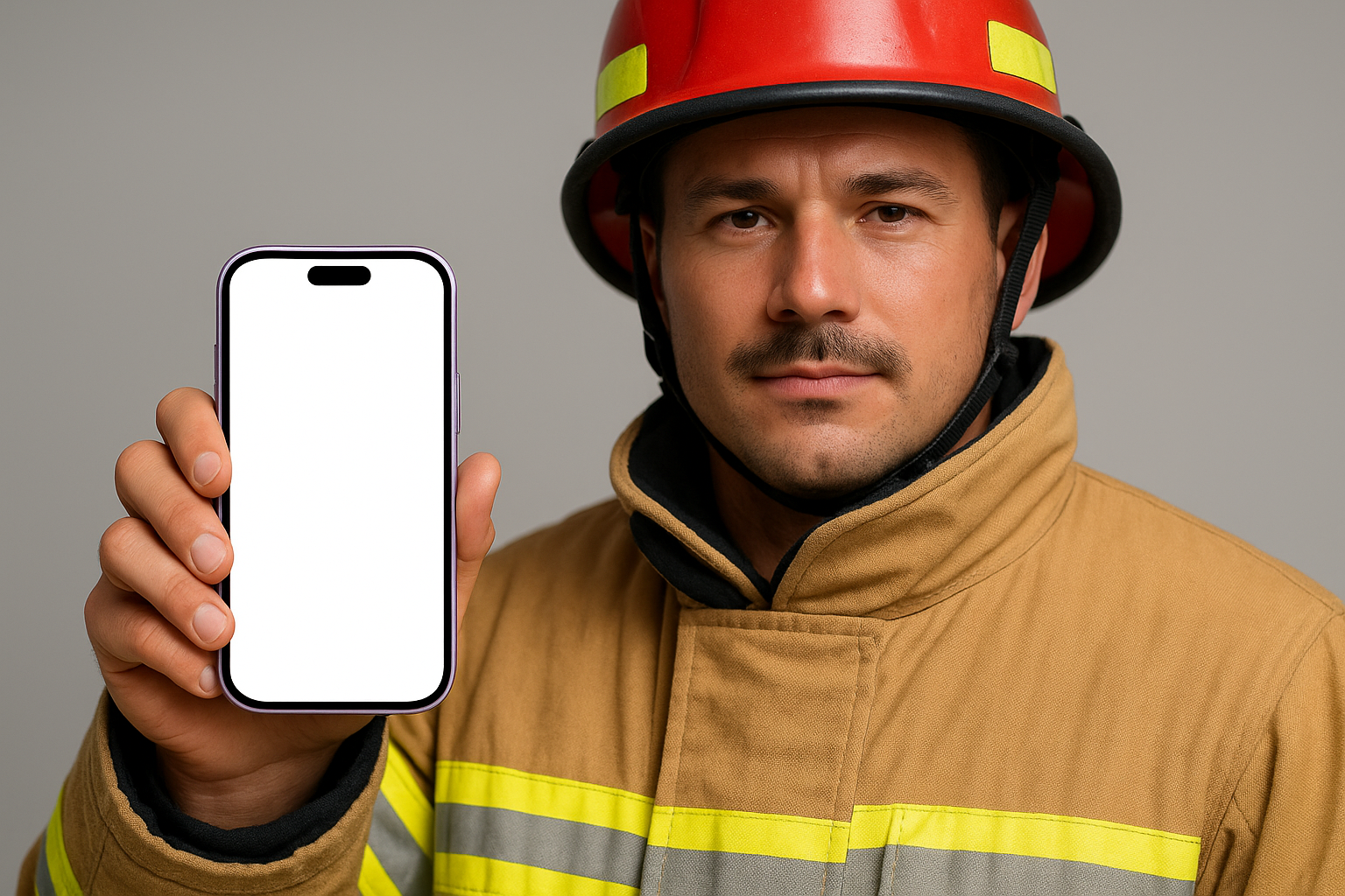 A firefighter in uniform holds a purple phone with a blank white screen, showcasing his serious expression and professional attire, set against a neutral background.