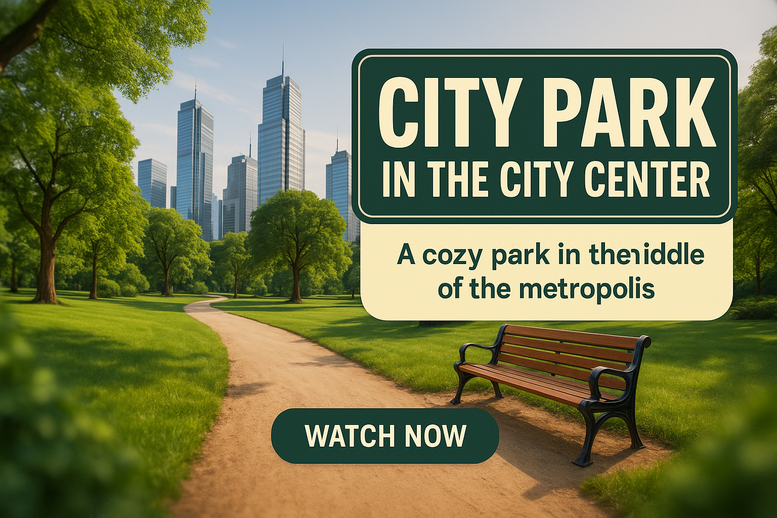 Vibrant promotional image showcasing a city park with skyscrapers in the background, designed for urban lifestyle marketing and tourism.