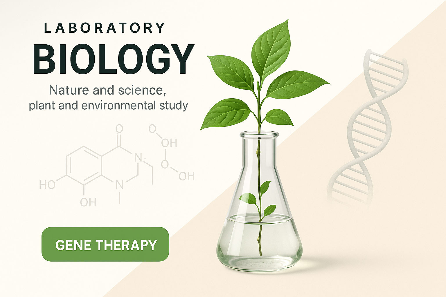 A modern biology lab scene featuring a glass flask with a plant, DNA structure, and molecular diagrams, emphasizing nature and science in gene therapy.