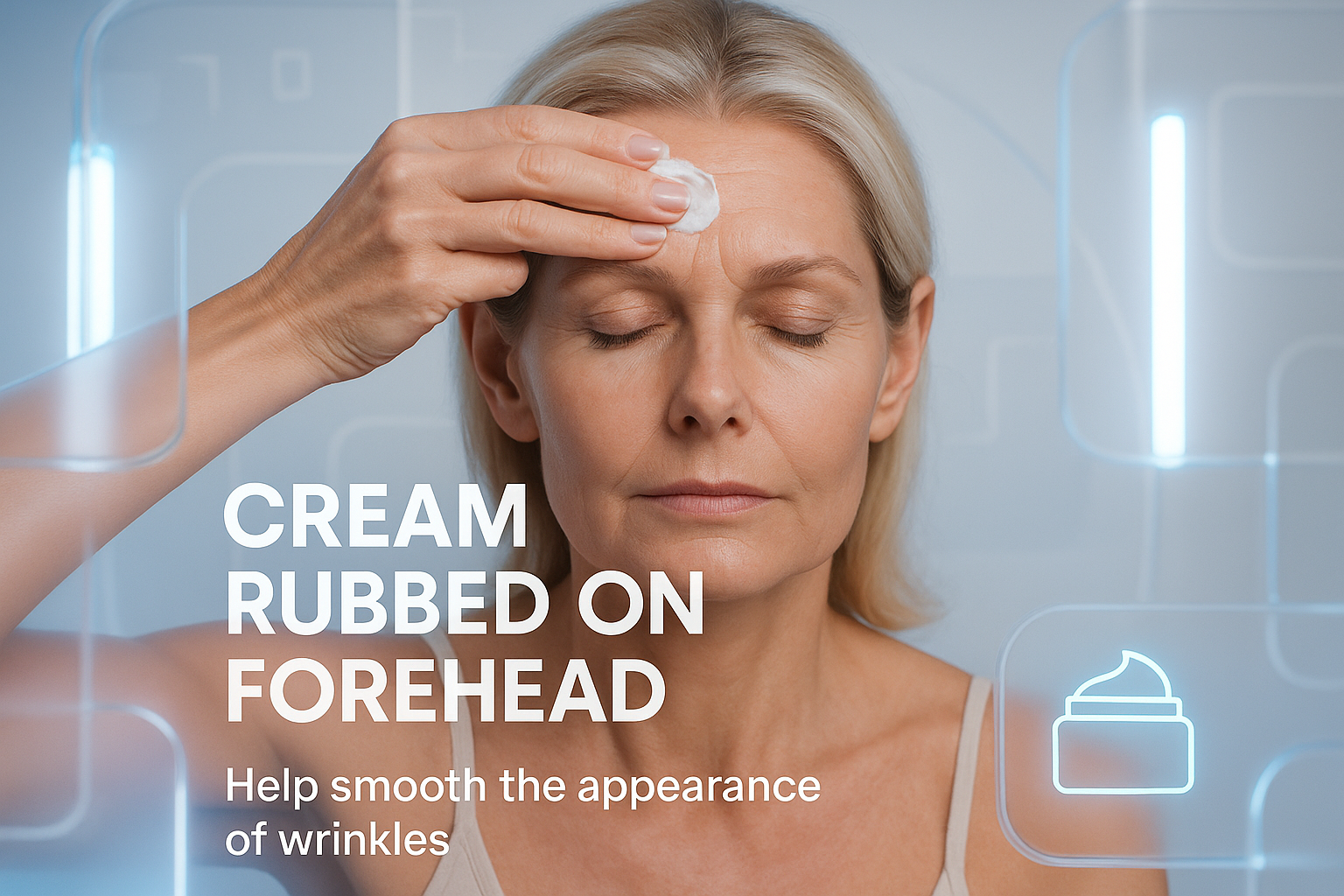 /Collection: /by davooda/Type: PNG/A visually appealing skincare promotional image showcasing a woman applying cream to her forehead, emphasizing anti-aging benefits. Ideal for beauty and skincare marketing.