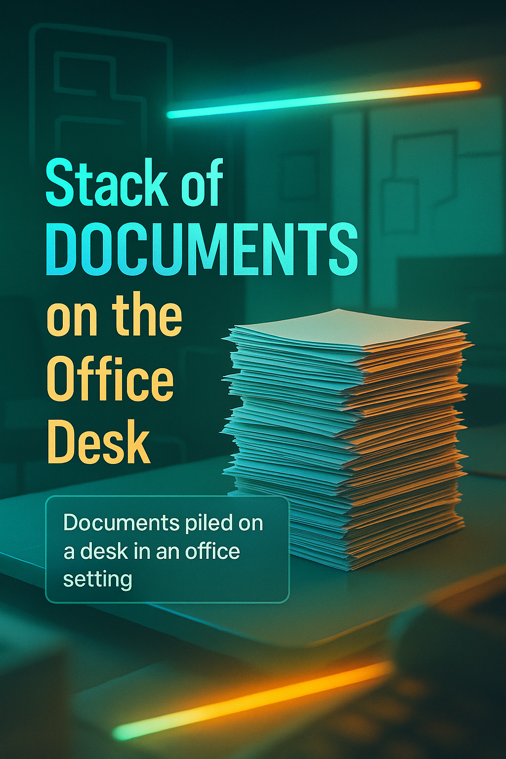 A modern office setting showcasing a neatly stacked pile of documents on a desk, with a soft glow accentuating the workspace, ideal for business-related content.