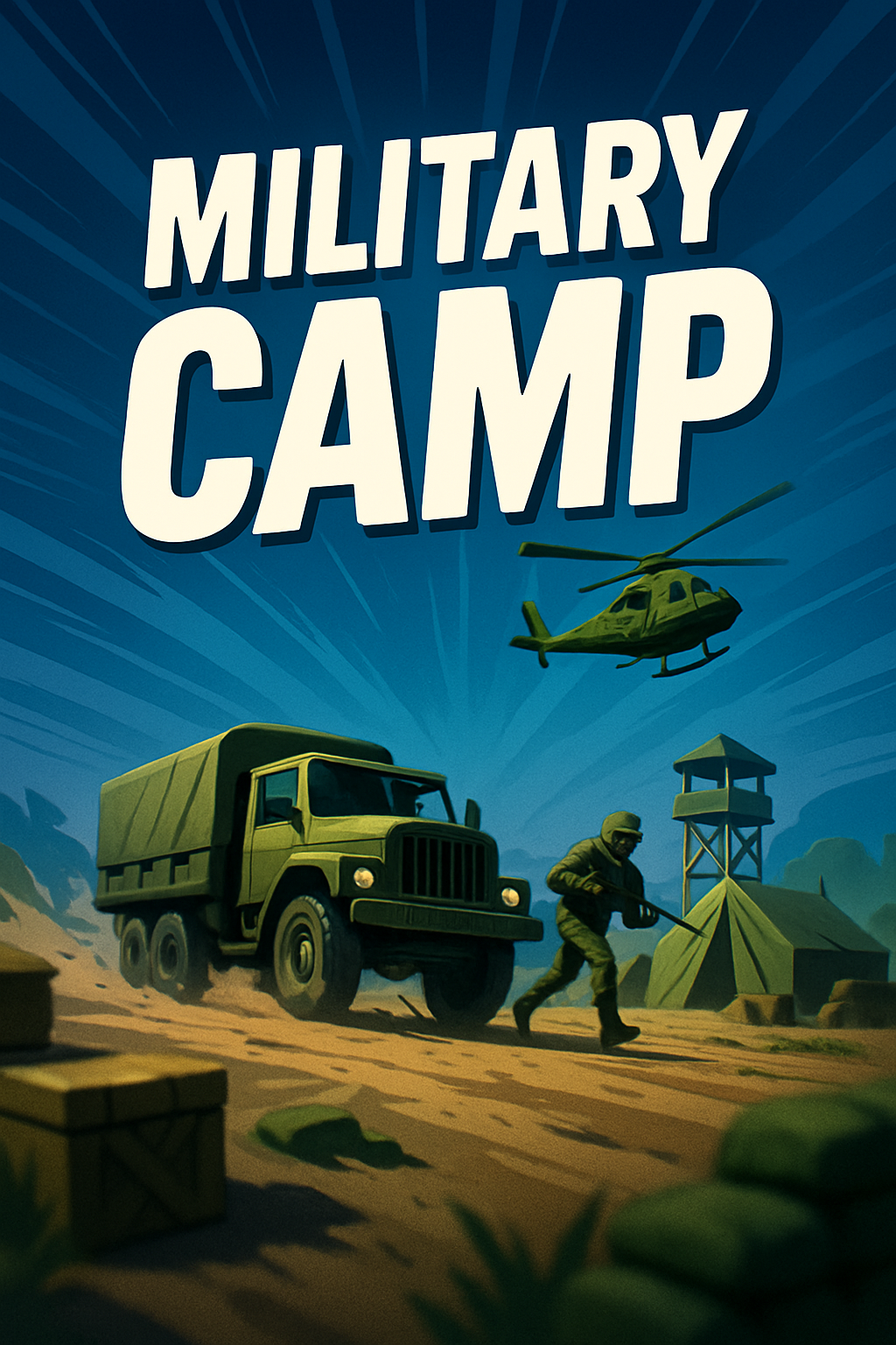 /Collection: /by davooda/Type: PNG/A vibrant illustration of a military camp featuring a soldier in action, a truck, and a helicopter, set against a dynamic background. The design emphasizes movement and depth.