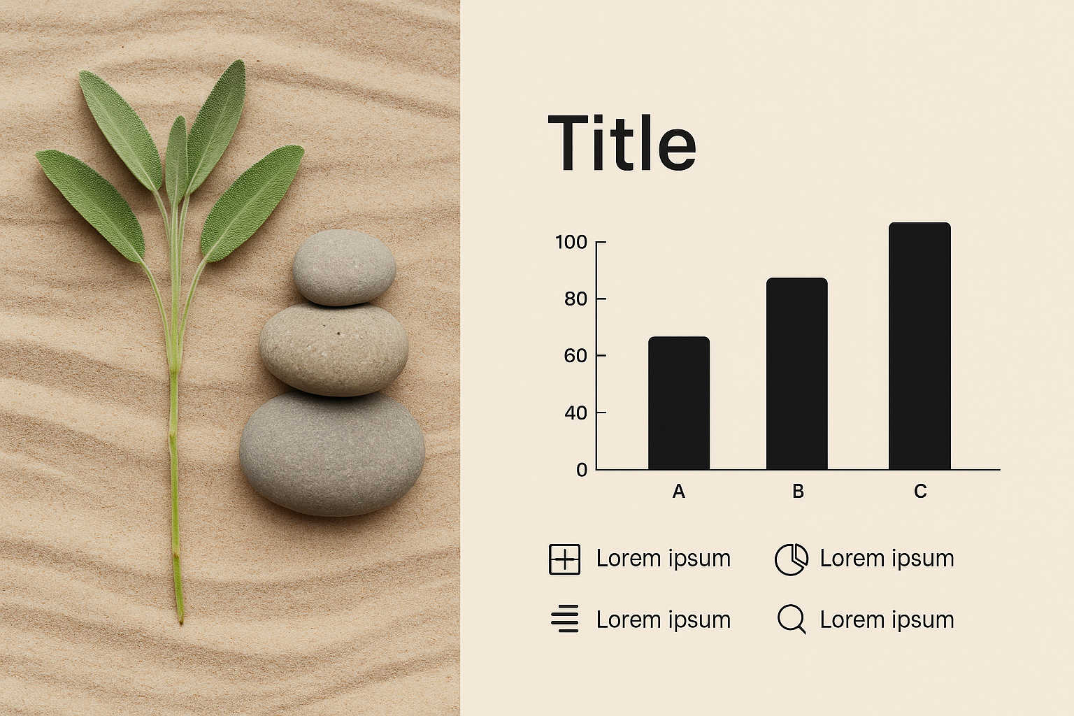 /Collection: /by davooda/Type: PNG/A minimalist infographic featuring stacked stones and a leaf on sandy texture, designed for presenting data in a serene, nature-themed style. Suitable for environmental or wellness topics.