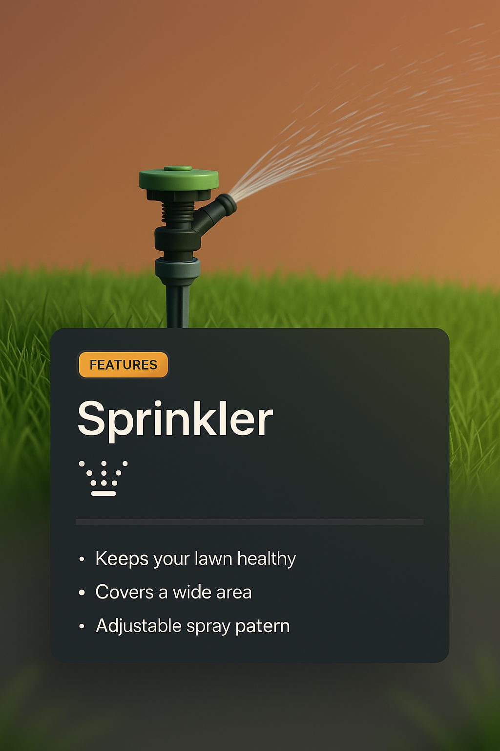 A visually striking 3D illustration of a sprinkler, featuring a dark banner with detailed features. The design includes a gradient background and a lush green lawn, enhancing the product's appeal.