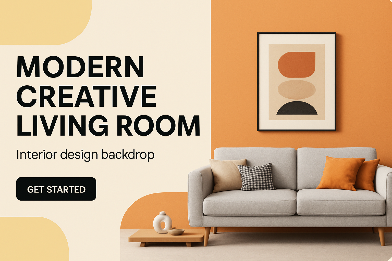 /Collection: /by davooda/Type: PNG/This image showcases a stylish living room interior with a modern sofa, decorative elements, and bold typography. The clean layout features geometric backgrounds and a call-to-action button.