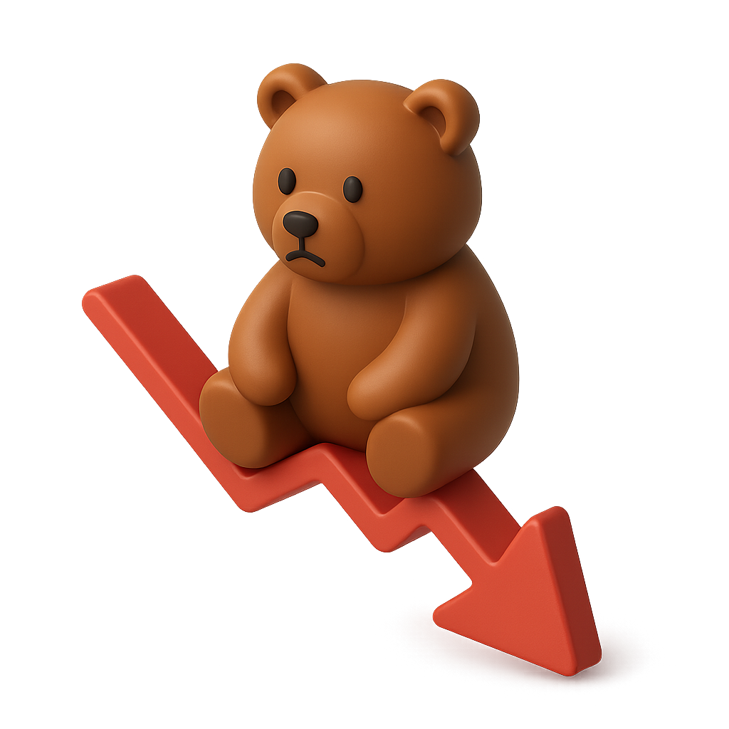 A stylized 3D bear figure sits atop a red downward arrow, symbolizing a bear market trend. The bear is brown with a soft, rounded design, set against a gradient background.