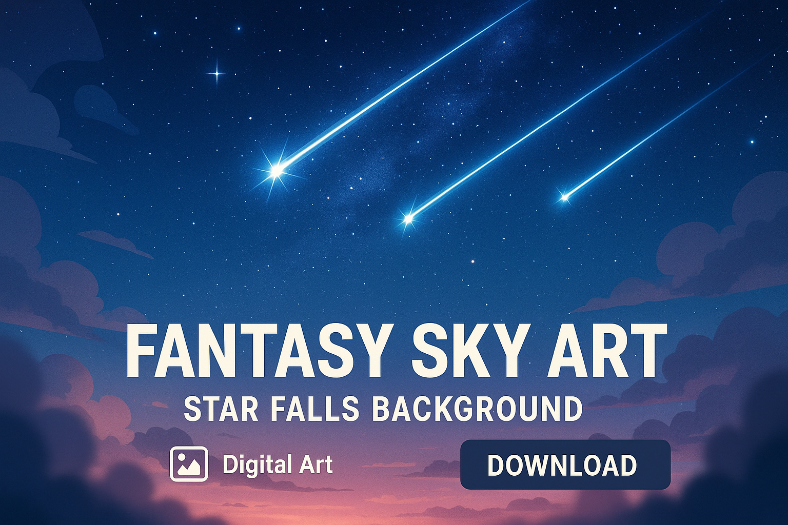 Vibrant digital art depicting a fantasy sky with shooting stars, perfect for backgrounds in creative projects or digital media. The calming color palette enhances its dreamy aesthetic.