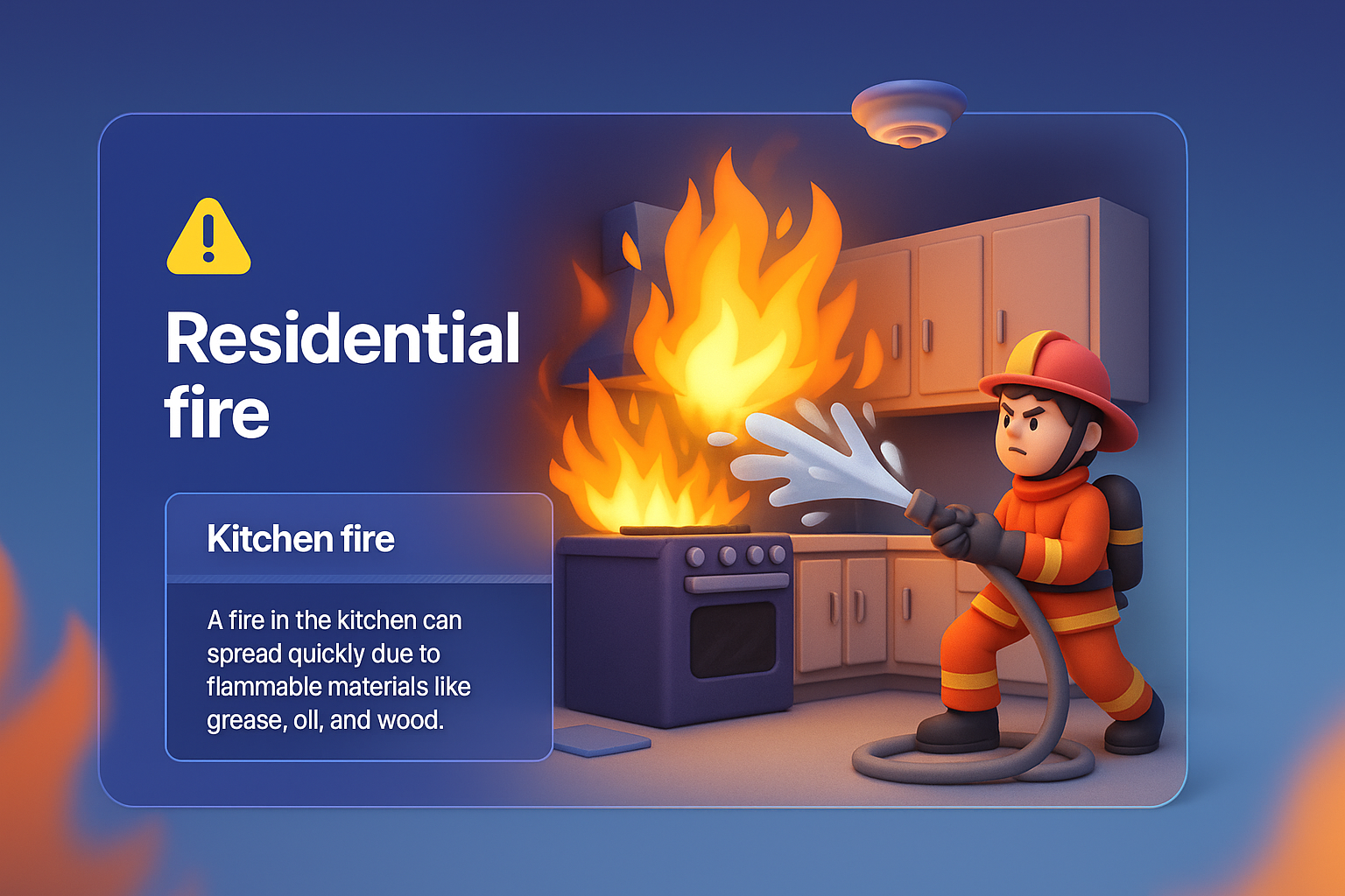 /Collection: /by davooda/Type: PNG/A 3D illustration depicting a firefighter combating a kitchen fire. The scene highlights flames, a stove, and a fire hose, emphasizing the urgency of kitchen fire safety.