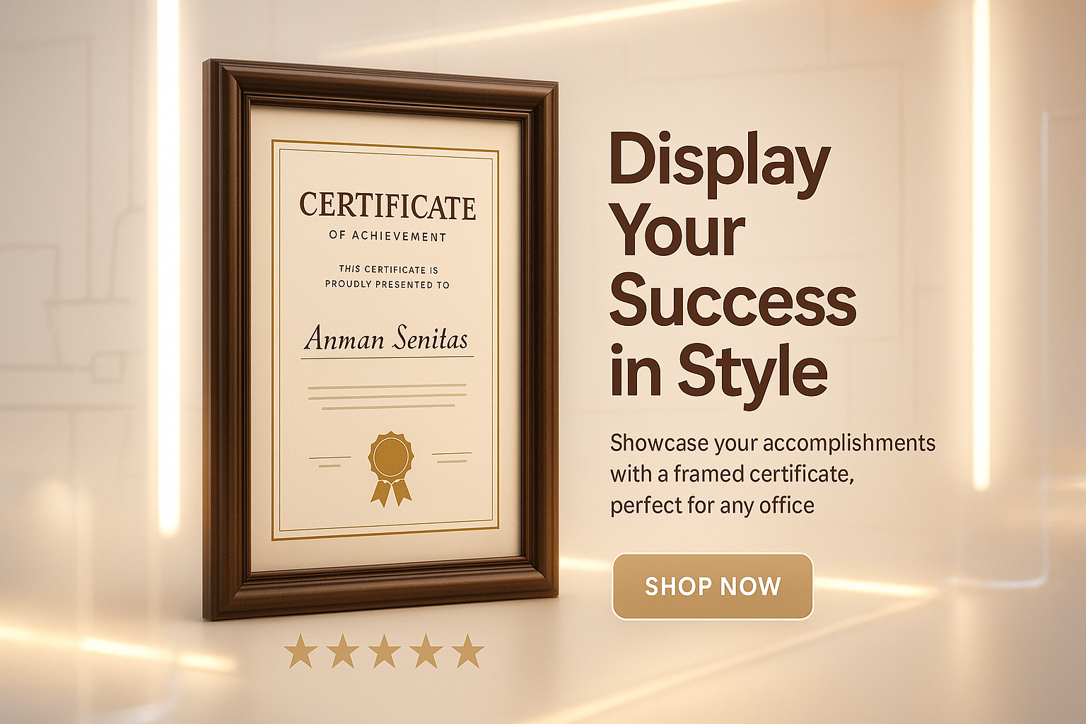 Promotional graphic showcasing a framed certificate of achievement, designed with a modern aesthetic. Ideal for office decor marketing.