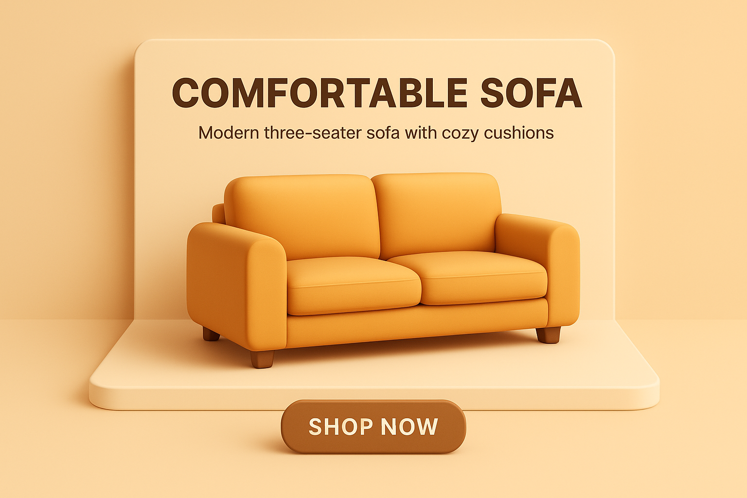 Stylish promotional image showcasing a modern three-seater sofa with cozy cushions, ideal for e-commerce and furniture marketing.