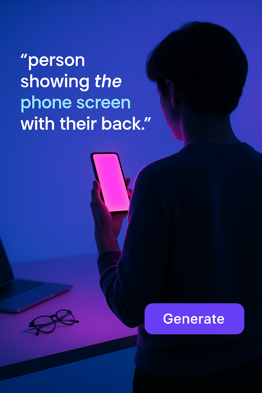 /Collection: /by davooda/Type: PNG/A person is seen from behind, holding a phone that glows intensely in neon pink. The scene features a solid blue background, enhancing the glow and creating an atmospheric effect.