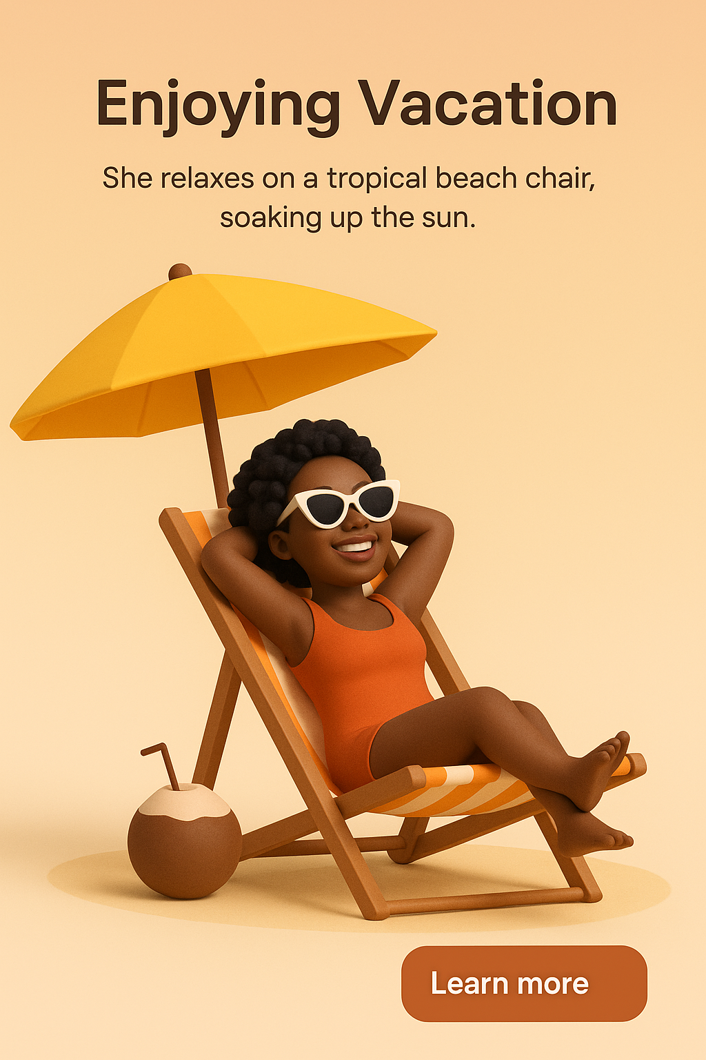 A joyful black woman in stylish sunglasses lounges on a tropical beach chair, enjoying her vacation. The scene features a gradient background, a beach umbrella, and a coconut drink.